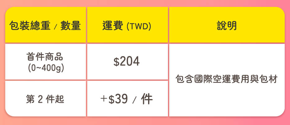 因應跨國物流運輸成本,運費採計方式如下: